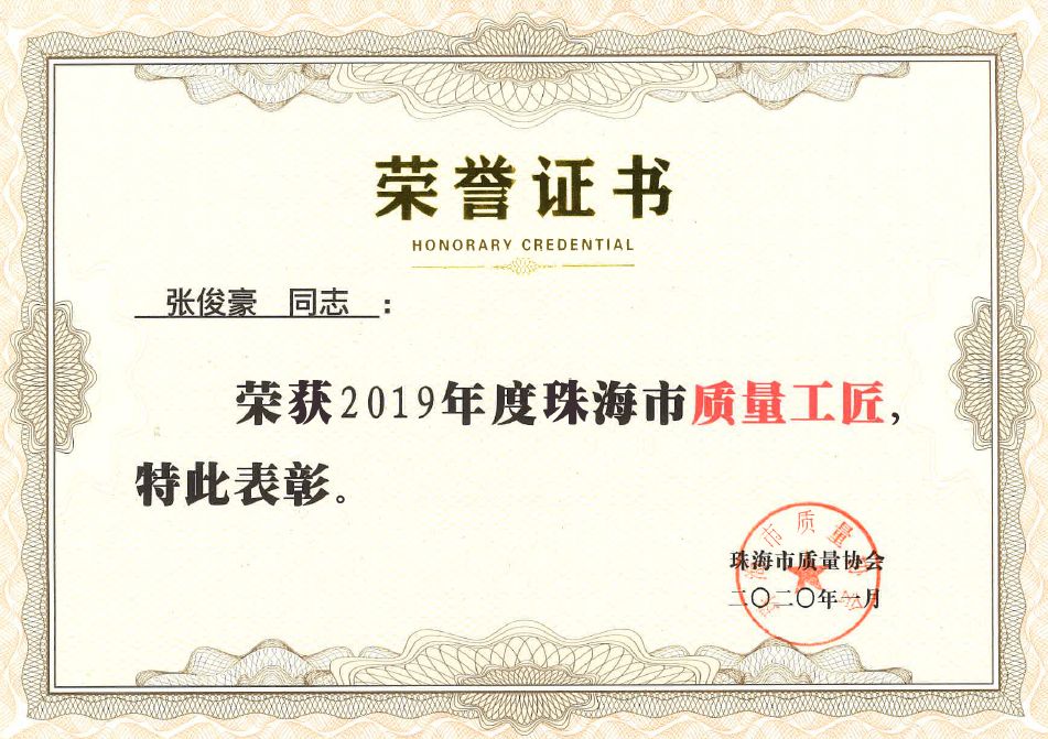 張俊豪在工作中,始終把提升產(chǎn)品質(zhì)量作為自己的最高追求并一以貫之付諸行動。“珠海市質(zhì)量工匠”榮譽的獲得,是對他把每件產(chǎn)品都做成精品、將質(zhì)量視為生命的職業(yè)操守的最好褒獎。
