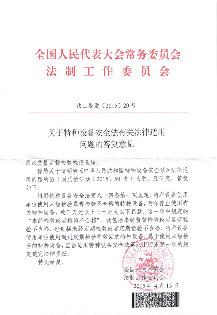 《關(guān)于特種設(shè)備安全法有關(guān)法律適用問(wèn)題的答復(fù)意見(jiàn)》(法工委發(fā)[2015]20號(hào))